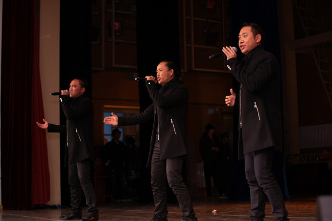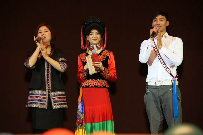 晚会主持人(左起):沙玛阿果、俄木(阿呷)金洛、马达nVd彝族人网(彝人网)- 彝族文化网络博物馆