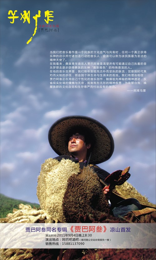 首个走出大凉山的彝族音乐研究生贾巴阿叁,经过一年多的精心准备,于今年7月初在成都发行了首张同名专辑《贾巴阿叁》。9月4日晚,阿叁将回到自己的家乡,在位于西昌顺河路的阿巴吧酒吧举行专辑签售会。