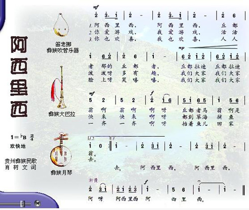 《阿西里西》是一首可称作世界名曲的彝族传统民歌,最早起源于赫章县珠市乡一带。“阿西里西”为彝语,大意是“我们都是好朋友,大家一起做游戏,一起来跳舞”,此歌旋律优美、奔放、欢快、热烈、极具地域和民族特色。依据此歌编排的舞蹈易学易跳,每逢重大节日,广大彝族同胞就在房前屋后、田间地头围着篝火表演舞蹈《阿西里西》。1956年12月,赫章彝族舞蹈《阿西里西》亮相全省民族民间业余文艺汇演,并取得成功,曲谱被录制成磁带,先后在贵州人民广播电台、中央人民广播电台播放;1964年12月,赫章县珠市彝族等乡的彝族演员杨德会、陆永忠、罗兴秀、罗林姐、龙宪英赴北京参加全国少数民族业余文艺观摩演出,毛泽东主席、周恩来总理亲自接见了他们,中央人民广播电台还播放了《阿西里西》舞蹈的音乐曲子。随后,《阿西里西》被选入小学音乐教材,并一直沿用至今,歌舞《阿西里西》因而声名远播,在全国各地成为彝族文化极具影响力的一张文化品牌。