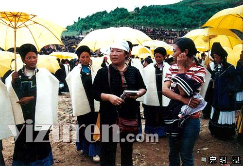 另外,许多人以为凉山彝族在色彩上是以黑为美,其实首先是以黄为美,这应是黄种人对于美的体位审美观。因为黄色是自己的肤色,以它为本。彝族叙事长诗《妈妈的女儿》里就有许多的以“黄”来表示美,如“黄荞馍”、“黄母鸡”、“黄的油”等。这在现在布拖就可以看见黄伞的流行,是有其民族审美心理的。“山上山下坡上坪坝集满了人群,举目望去到处是金灿灿的伞,满山遍野色彩缤纷,金翠华彩,好似黄色的蘑菇丛生。阳光透过黄伞,照在姑娘脸上,好似―层淡黄色的扑粉擦在黄润润的脸蛋,姑娘显得特别漂亮。”