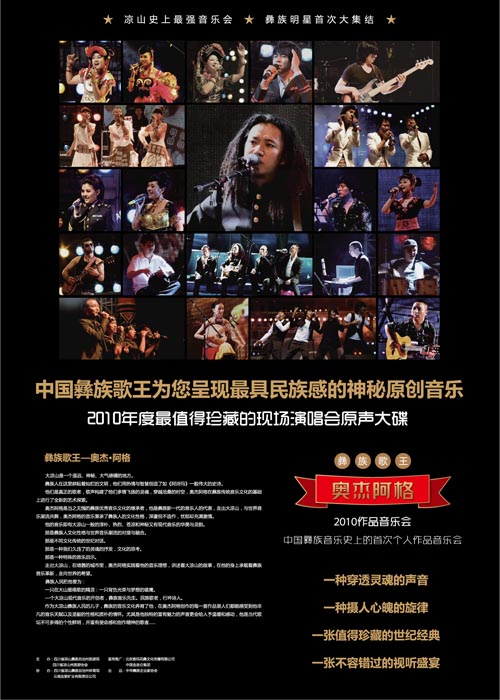 据了解,《奥杰阿格2010作品音乐会》高清DVD由中华彝族企业家出品,北京索玛花彝文化传播有限公司和中国金昆仑集团宣传推广。