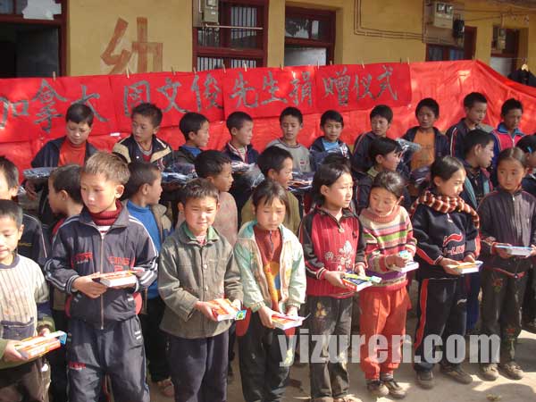 随后,在周先生的努力下,加拿大福慧基金会同意将此班列入“福慧之星”第三班。11月2日,他再次委托赵静特购买价值5000元的60套寒衣,60套手套,80本新华字典以及铅笔、本子等学习生活用品发给38个教育盲区学生,22个孤儿,20名成绩优秀的学生。当乡党委政府和包乡单位县工商局的领导和校长把衣服发到学生手中时,学生们十分感动,齐声高喊:“感谢周爷爷”!