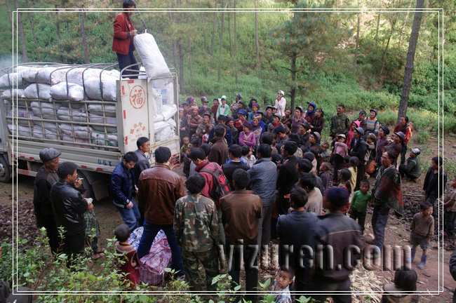 汽车两点过开始出发,一个是网友“研究僧”的皮卡车,一个是租来的货车,装了满满一货车的衣服,一共110袋,索玛花支教助学联盟发起人黄老邪统计上来有106个学生,每个学生一袋,多装了四袋。还有手套和帽子。18公里路,汽车开了近一个小时。到了四合乡永定村火普组,村民们已经等在那里了。