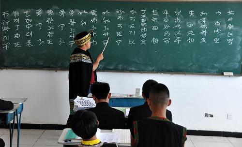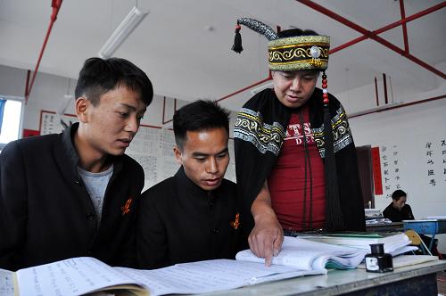 2015年7月10日,毕节彝文双语职业学校的老师在指导学生认识彝族文字。贵州毕节彝文双语职业学校自2012年创办以来,学校实行全免费招收学生和教学的方式,聘请当地民族民间文化传承人作为老师,对有志学习和研究彝族文化和国学的各民族青少年进行课堂指导。授课时间一般为三年,授课内容主要以彝文认识、彝语翻译、布摩经书研究为主,旨在更好地保护、传承古老彝族文化。目前,学校已连续招收学生240人,其中102名学生已毕业。这些学生将成为抢救整理当地彝族民间经文古籍,传承民族文化的专门人才。新华社发(杨文斌摄)