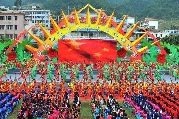 10月28日,云南省普洱市镇沅彝族哈尼族拉祜族自治县举行20周年县庆。当地各族群众身着节日盛装,载歌载舞欢聚一堂,祝贺自治县成立20周年。这是庆典大会上的大型歌舞表演。(新华社记者 陈海宁 摄影)