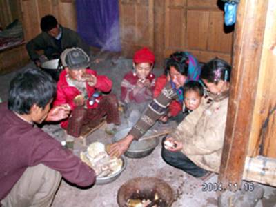 饭前先要祭祖:把人们还未偿到口的肉和汤各要一部分,用来在火塘上逆时针转一下,嘴里说着:说说(表示去秽),俄木约尔家今天“九龙机”了……说着说着就端进了“尼莫”(进门时火塘的最右上边方向),听约尔叔叔介绍说,这就是对祖先的尊重,同时也是一种请求,请求他们保佑全家吉祥如意……