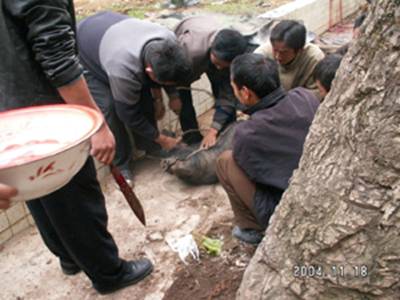 约尔叔叔说,他家今天过年要杀3头猪,怕是明天手脚不够,今天下午就杀了一头大肥猪。下午5时,约尔叔叔叫来邻近的几个助手,由于人多,我就不用动手了。