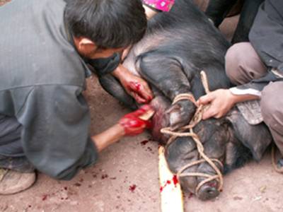 11月18日,今天是美姑县城大年(枯妈阿莫),这里的杀猪习惯与乡下不太一样,7点天亮,县城各处开始响起了尖锐的杀猪声,由于我家人手少,等到9时许才杀了年猪,在姐夫的帮忙下,我们把猪毛烧好了,可就是砍不来猪了,因为要背给人家,乱砍是不行的,幸好好心的邻居海来伍子舅舅来了,帮我们把猪肉都砍巴巴适适的。