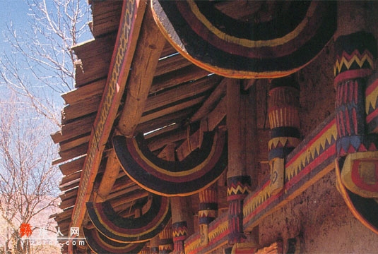 彝族民居建筑极讲究装饰,大门入口和屋檐是装饰的重点,常常在大门上作各种拱形案图并常有门楣。门楣刻有日、月、鸟兽等图案,封檐板刻有粗糙的锯齿形和简单的图案;屋脊中部及两端有简单的起翘及起拱,山墙的悬鱼、屋檐的挑拱、垂花柱、屋内的梁枋、拱架等也雕刻有牛羊头、鸟兽、花草等线脚装饰和连续案浮雕;室内锅庄石上及石础、石门槛上雕刻怪兽神鸟、卷草花木等彝族传统图案;门窗隔扇及室内木隔花纹、小花格窗等,极富建筑装饰效果,体现了彝族人民的审美情趣和建造艺术。