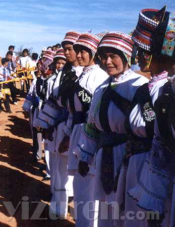 撒尼妇女服饰色彩鲜艳,美观大方,工艺精巧,一件服饰可谓一件精美艺术品。撒尼妇女头饰彝语叫"喔姐"呈半圆形,似天上彩虹。包头上的色彩和饰物随年龄,婚否略有区别。