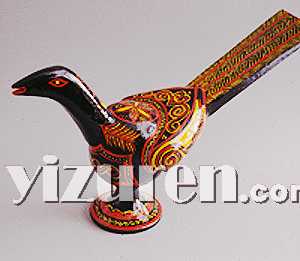 凉山彝族漆器也有明显的社会文化色彩,其造型与彝人的审美观念密不可分,如扁圆形酒壶由两半成母子扣合,木钵也由盖和器身成母子扣合等,这与彝族自古相传的“万物雌雄观”是一脉相承的,故而有万物以成双为吉、成对为美的观念。漆器的传统使用惯俗中,与彝族社会分层中的等级制度有关,如过去鹰爪杯只能为贵族黑彝使用,而百姓不能妄为,否则将被视为潜越特权而受处置。漆器还与彝族民间信仰有关,如漆器中造型风格突出的鹰爪杯、雁爪杯、牛角杯和野猪蹄杯等饮酒器具,其胎骨直接取之于动物体,经磨制彩绘而成,古朴自然。而这些动物均为凶猛、力量的化身,借用其角、爪为胎骨,既反映了凉山彝族先民的鹰图腾观念和动物崇拜心理,同时也反映了彝人尚武好勇的民族气质。此外,漆器的纹饰与图案中还潜存着彝人古老信仰,并有相关的神话背景。