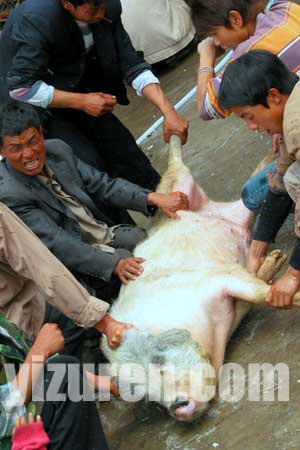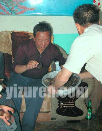 这时,管伙食的小伙子们早已把猪杀毕,大家便开怀大吃大喝,而所宰杀的这些猪的半边头要送给媒人。