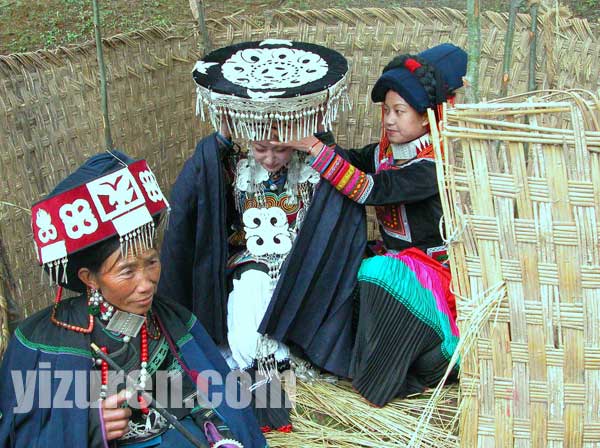 一阵骚乱之后,我们抢到了新娘,并将新娘背到屋外一间临时搭起的草棚里,为她梳洗打扮,更换新衣。从这时起,新娘就开始禁食了。“禁食”是彝族婚礼中的一种禁忌。为什么会有这种禁忌,彝族传说是这样的: