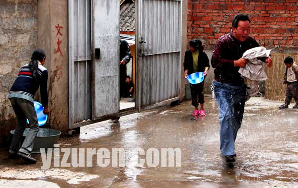 按照彝族传统,我们这支队伍在女家受到了种种考验。第一个考验是泼水。当女家闻知我们前去迎亲时,新娘的姐妹和至亲好友早就做好了储水准备,专等我们接亲的人。啊?,我们一到门口,一瓢瓢,一盆盆清水劈头盖脸泼来。顿时,我们一个个成了落汤鸡。但又不能有任何怨言,相反地要表现出抢婚者百倍的勇敢。在一片欢闹声中,我们将身上披的“察尔瓦”聚在头上,有的乘着混乱之机冲进屋里,有的抢过对方手中的水桶反泼过去,使水战打得难解难分,经过近30分才停止。