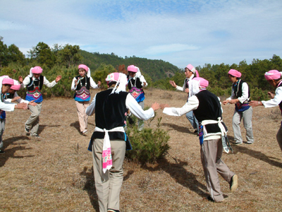 在绿汁镇的彝族聚居的者拉、龙格利等地,数百年来每到农历正月十六和三月二十七、二十八、二十九三天或有人家娶妻嫁女,夕阳西下之时,远远近近的彝族和其他民族群众不邀而到,弹起龙头弦子,男女和声或齐声唱起左脚调,手牵手、肩并肩,围成一个个几十乃至上百人的大圆圈,欢跳左脚舞。伴着铮铮作响的弦音,和着高亢清脆的歌调,他们时而蹉脚闪腰,时而折步跌脚,时而甩腿对脚,时而摆手转身,舞步整齐统一,舞姿轻盈健美。