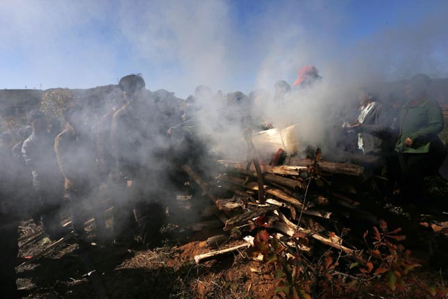 2015年11月9日,于四川大凉山深处布拖县,在众人的哭声中,阿尔什古的遗体被抬到柴火堆上。